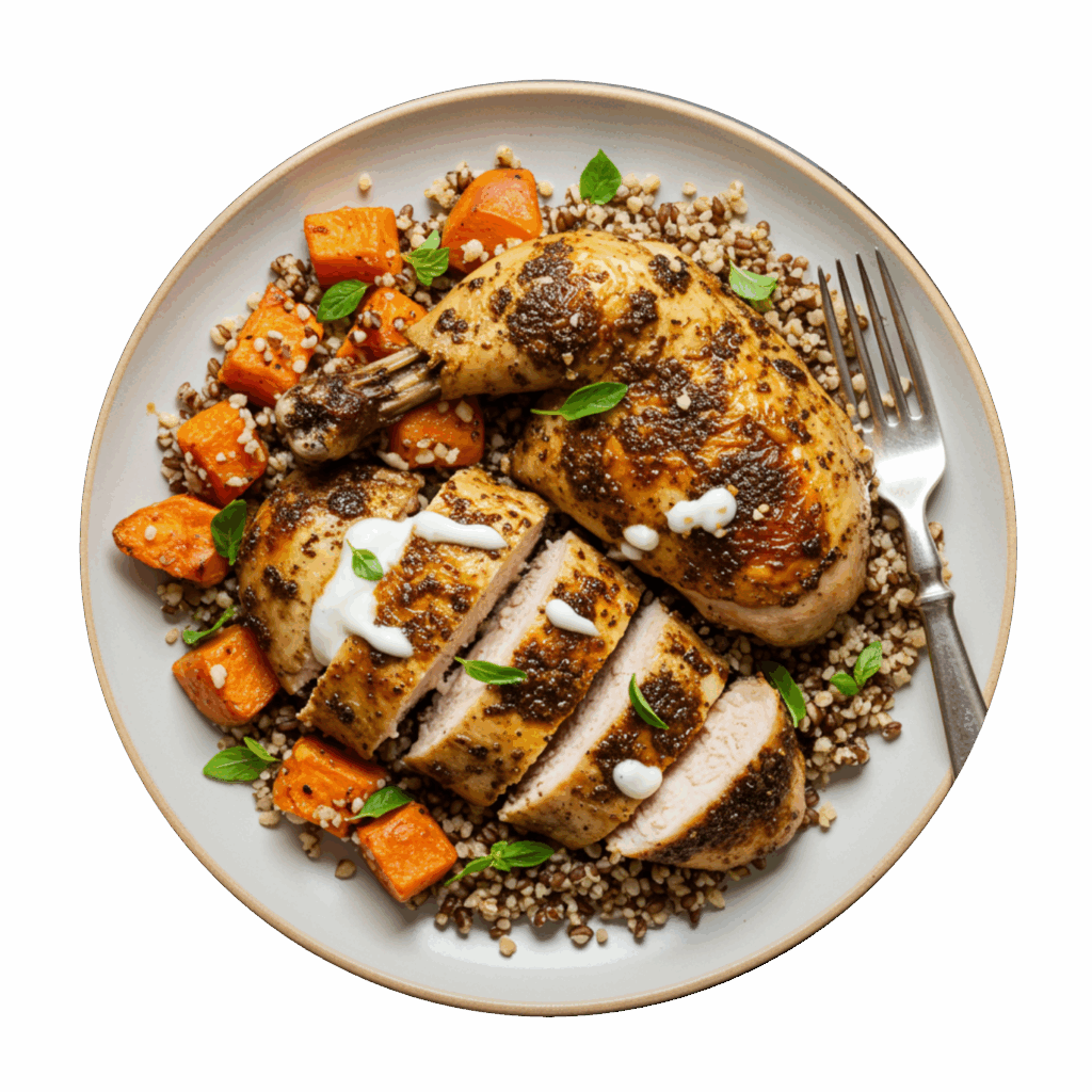 Juicy za’atar-marinated chicken with roasted sweet potato, nutty freekeh, and a creamy tahini yoghurt. A perfect balance of spice, comfort, and crunch.